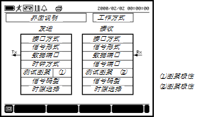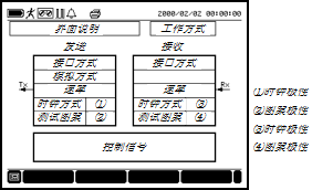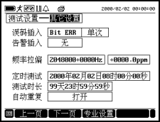 把光标移到 界面说明 栏,可选择上一页、下一页或专业设置。测试设置由Tx/Rx1/DATA端口设置、Rx2端口设置、其它设置和打印设置4个界面组成。