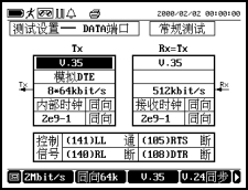 图2.2是接口方式为V.35、V.24同步、X.21、RS449时的界面,左边表示发送端口的设置,右边表示接收端口的设置,各栏代表的含义如图2.3所示。