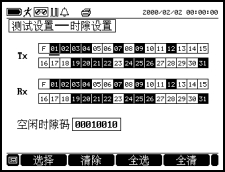 用光标移动键将光标移至欲选择的时隙号下,按 F1 选择该时隙,时隙号显示黑色。按F2 清除该时隙,时隙号显示反白。按 F3 选择所有时隙,按 F4 清除所有时隙。对于选中的时隙,测试图案被插入。