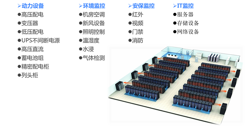 GT-RMS01动环监控系统是西安光谷防务有限公司基于物联网、大数据、云计算、人工智能等技术,对机房运行状态和环境状态进行自动监测,为客户提供可靠、实用动力和环境管理平台,涵盖动力、环境、视频、安防、消防、设备、能耗管理、人员管理于一体的整体系统,实现“实时监测、事前预警、事中报警、事后取证”的安全管理模式,为客户安全管理自动化、系统化带来全新感受和体验。