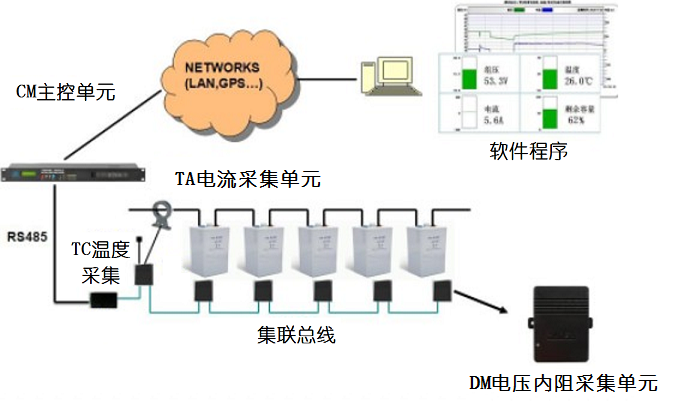 本方案蓄电池在线监测系统主要由CM主控单元﹑DM电压内阻模块、TA电流模块、TC温度模块组成
