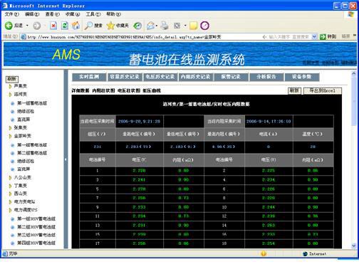 此界面以数据形式显示,数据可以以EXCEL导出编辑。显示参数有:组压,单体最高电压和最低电压序号、单体最高内阻序号、电流、环境温度及列表显示每节蓄电池的电压值和内阻值。