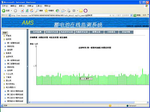 此界面以柱状图形式显示,当某节蓄电池内阻超出阀值,整条柱状显红色;鼠标移到每条柱状时会显示单节电池序号和内阻值;