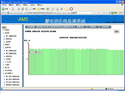 此界面以柱状图形式显示,当某节蓄电池电压超上限和下限阀值,整条柱状显红色;鼠标移到每条柱状时会显示单节电池序号和电压值;