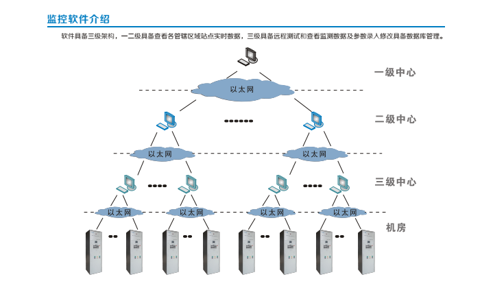 数据管理平台具备三级架构,一二级具备查看各管辖区域站点实时数据,三级具备远程测试和查看监测数据及参数录入修改具备数据库管理。