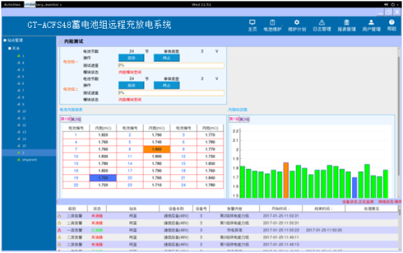 作为后备电源使用的蓄电池是确保通信设备不间断运行的最后一道生命线。如果蓄电池维护不当,将面临市电中断蓄电池供电能力不足,造成系统瘫痪,通信中断。而目前蓄电池组的常规维护主要由人工利用常规的放电测试仪表根据相关规范进行。这样的维护需将电池组脱离系统,增大系统死机和中断风险,放电时间长,且需人工测试记录,工作量大,离线测试完被测电池组电压与系统电压压差大,在并系统时存在打火现象,存在安全隐患。且随着蓄电池组大面积广泛使用,人工维护显然不能满足实际需求,实际中由于蓄电池使用不当或维护不及时导致的安全事故在逐年增加。基于蓄电池维护的现状,我们公司自主研发生产GT-ACFS48蓄电池组远程充放电系统。