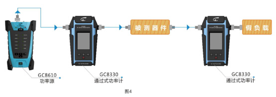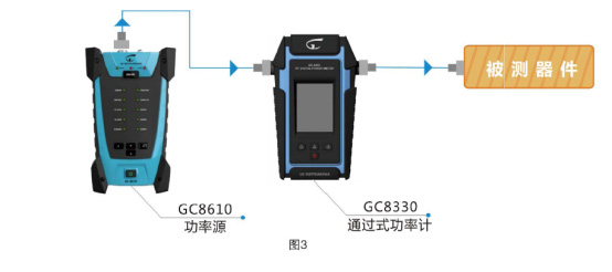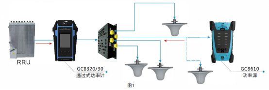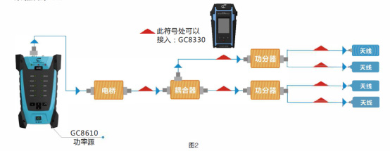在日常的维护排查工作中,经常发现宏站中存在天线及接头器件老化、损坏、性能降低的现象,室分站点中也有相当一部分无源器件存在老化、损坏等现象, 直接影响天馈系统及室分系统的网络质量。。如上图3 ,测量天线/无源器件的驻波比。用功率源GC8610和功率计GC8330配合,在提供足够大的功率的同时,保证了安全性,使驻波比测量在准工况下进行,从而提高了测量结果的可信度。